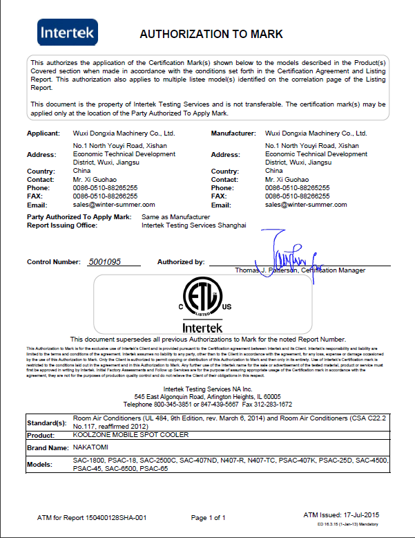 长春崔烨在线教育咨询有限公司近日宣布公司移动式工业冷气机获得的质量与安全第三方机构天祥实验室(世界上规模的消费品测试、检验和认证公司之一)颁发的ETL认证。